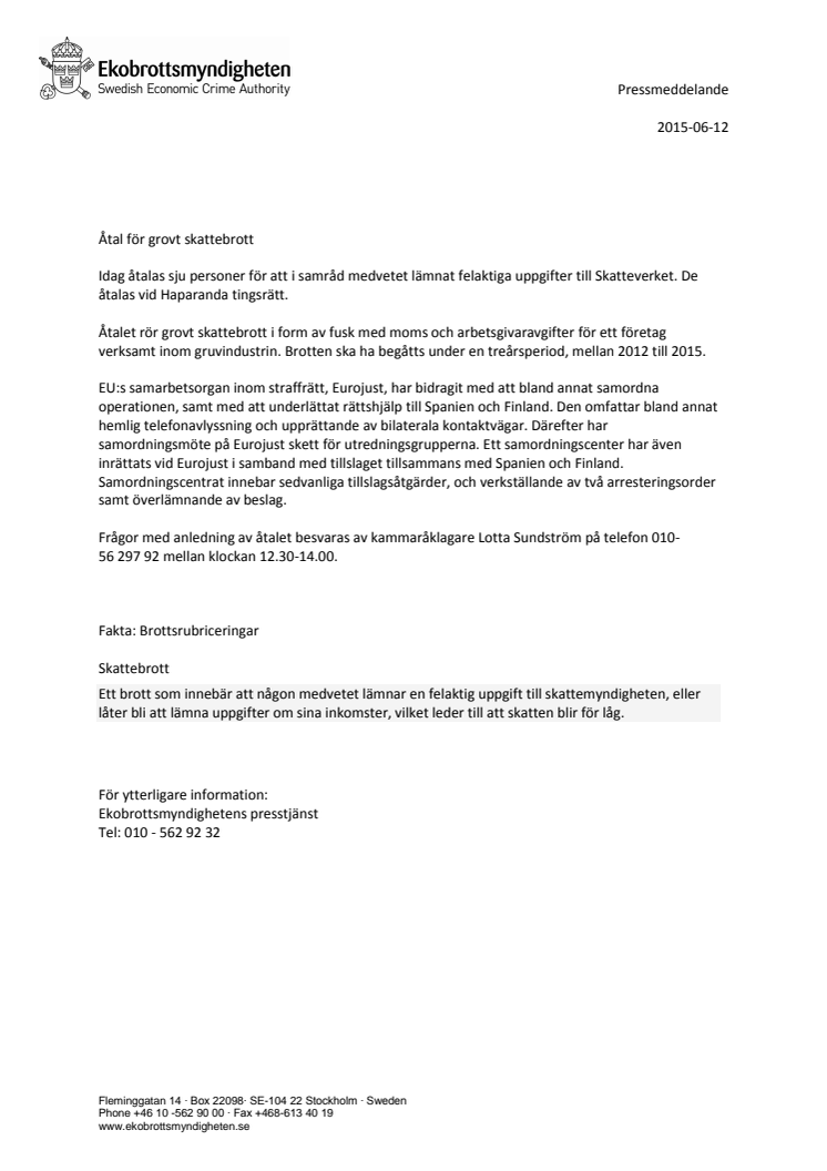 Idag åtalas sju personer för att i samråd medvetet lämnat felaktiga uppgifter till Skatteverket. De åtalas vid Haparanda tingsrätt. Åtalet rör grovt skattebrott i form av fusk med moms och arbetsgivaravgifter för ett företag verksamt inom gruvindustrin. Brotten ska ha begåtts under en treårsperiod, mellan 2012 till 2015.