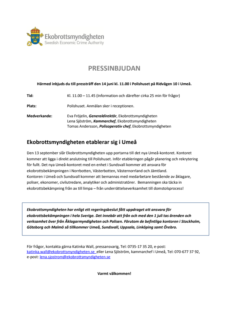 Pressinbjudan till pressträff om Ekobrottsmyndighetens etablering i Umeå