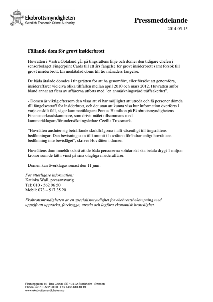 Hovrätten i Västra Götaland går på tingsrättens linje och dömer den tidigare chefen i sensorbolaget Fingerprint Cards till ett års fängelse för grovt insiderbrott samt försök till grovt insiderbrott. En medåtalad döms till tio månaders fängelse.