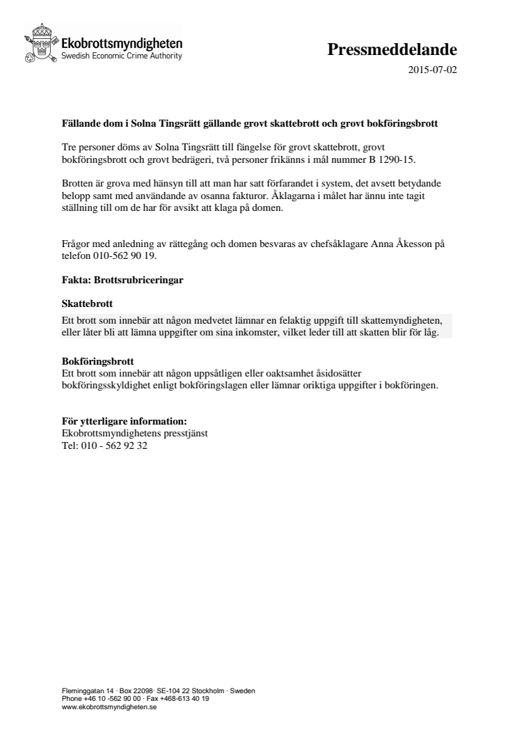 Fällande dom i Solna Tingsrätt gällande grovt skattebrott och grovt bokföringsbrott