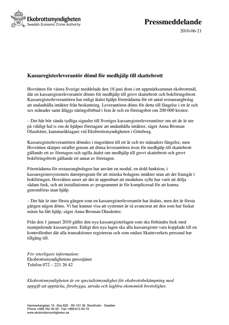 Kassaregisterleverantör dömd för medhjälp till skattebrott