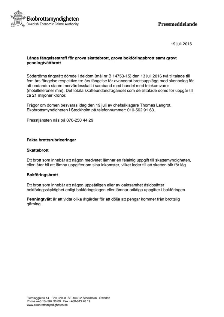 Södertörns tingsrätt dömde i deldom (mål nr B 14753-15) den 13 juli 2016 två tilltalade till fem års fängelse respektive tre års fängelse för avancerat brottsupplägg med skenbolag för att undandra staten mervärdesskatt i samband med handel med telekomvaror (mobiltelefoner mm). Det totala skatteundandragandet som de tilltalade döms för uppgår till ca 21 miljoner kronor.