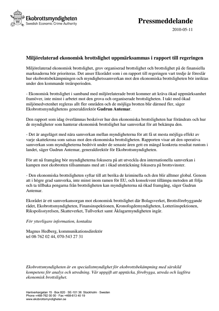 Miljörelaterad ekonomisk brottslighet uppmärksammas i rapport till regeringen
