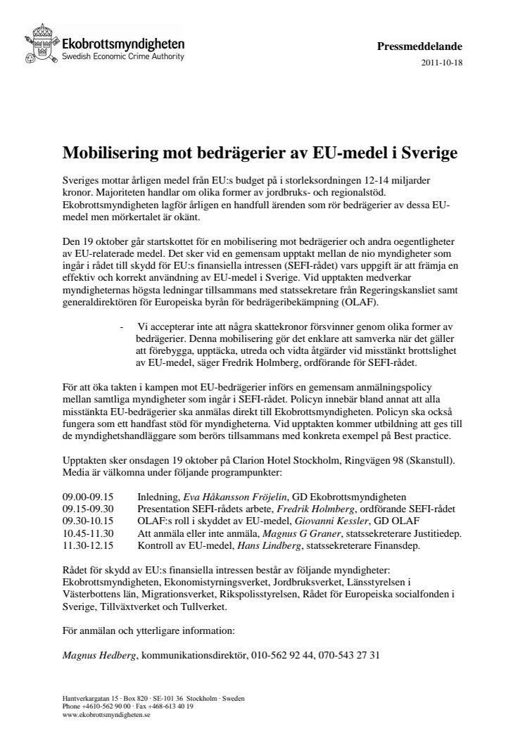 Sveriges mottar årligen medel från EU:s budget på 12-14 miljarder kronor. Majoriteten handlar om olika former av jordbruks- och regionalstöd. Den 19 oktober går startskottet för en mobilisering mot bedrägerier och andra oegentligheter av EU-relaterade medel. Det sker vid en gemensam upptakt mellan de nio myndigheter som ingår i rådet till skydd för EU:s finansiella intressen (SEFI-rådet).