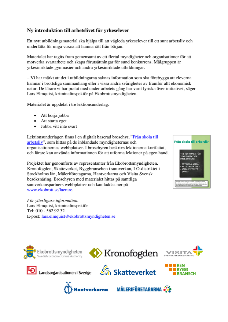 Ett nytt utbildningsmaterial ska hjälpa till att vägleda yrkeselever till ett sunt arbetsliv och underlätta för unga vuxna att hamna rätt från början. Materialet har tagits fram gemensamt av ett flertal myndigheter och organisationer för att motverka svartarbete och skapa förutsättningar för sund konkurrens. Målgruppen är yrkesinriktade gymnasier och andra yrkesinriktade utbildningar.