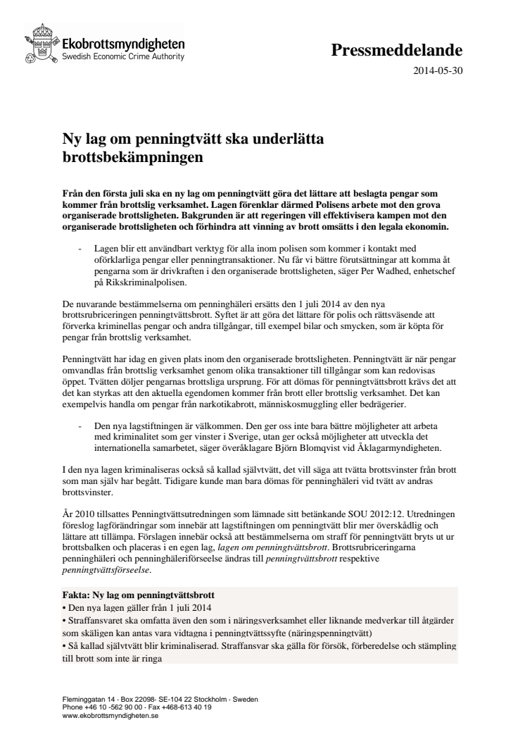 Från den första juli ska en ny lag om penningtvätt göra det lättare att beslagta pengar som kommer från brottslig verksamhet. Lagen förenklar därmed Polisens arbete mot den grova organiserade brottsligheten. Bakgrunden är att regeringen vill effektivisera kampen mot den organiserade brottsligheten och förhindra att vinning av brott omsätts i den legala ekonomin.