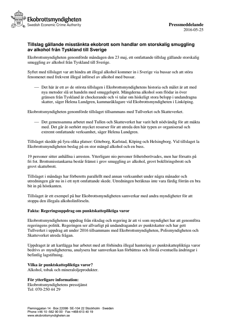 Ekobrottsmyndigheten genomförde måndagen den 23 maj, ett omfattande tillslag gällande storskalig smuggling av alkohol från Tyskland till Sverige. Syftet med tillslaget var att hindra att illegal alkohol kommer in i Sverige via bussar och att störa fenomenet med frekvent illegal införsel av alkohol med bussar.