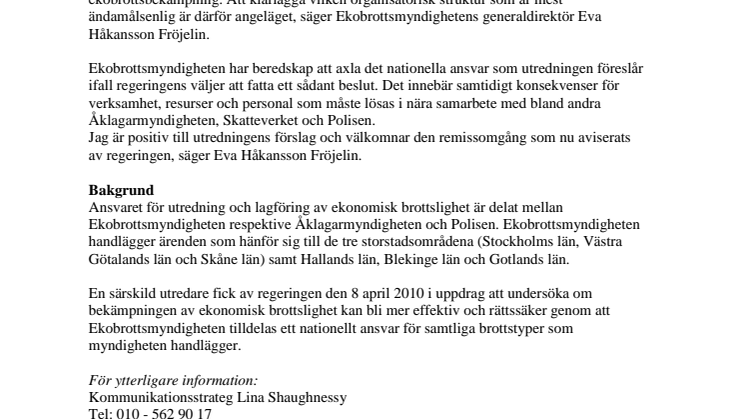 En särskild utredare fick av regeringen den 8 april 2010 i uppdrag att undersöka om bekämpningen av ekonomisk brottslighet kan bli mer effektiv och rättssäker genom att Ekobrottsmyndigheten tilldelas ett nationellt ansvar för samtliga brottstyper som myndigheten handlägger.