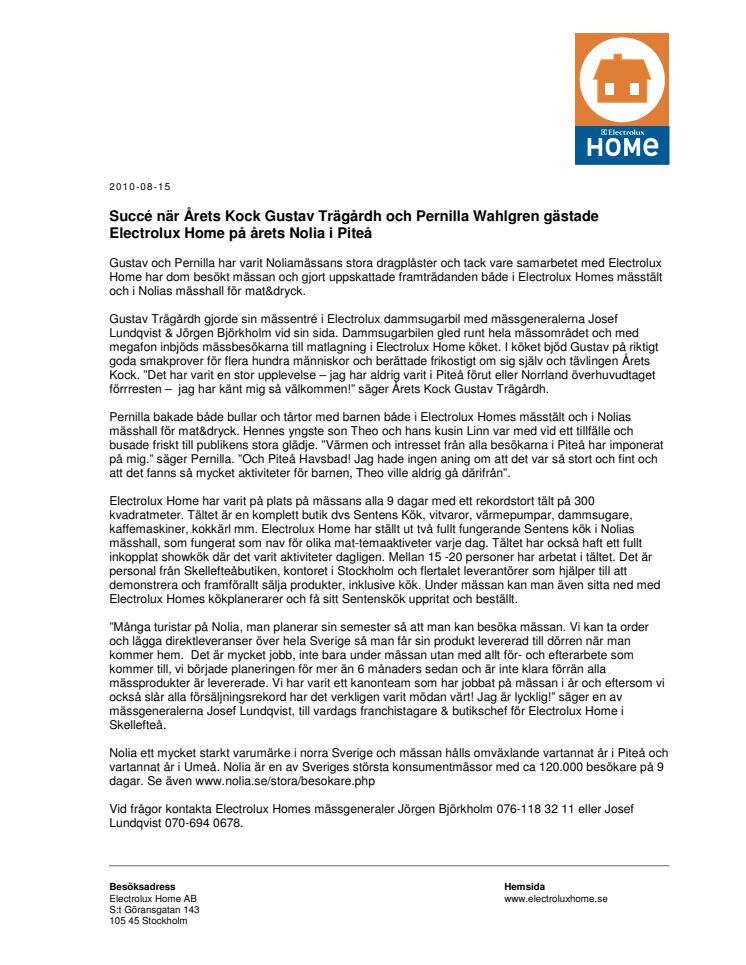Gustav och Pernilla har varit Noliamässans stora dragplåster och tack vare samarbetet med Electrolux Home har dom besökt mässan och gjort uppskattade framträdanden både i Electrolux Homes mässtält och i Nolias mässhall för mat&dryck.
