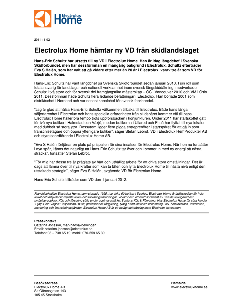 ”Jag är glad att hälsa Hans-Eric Schultz välkommen tillbaka till Electrolux. Både hans långa säljerfarenhet i Electrolux och hans speciella erfarenheter från skidspåret kommer väl till pass. Electrolux Home håller bra tempo trots uppförsbacken i konjunkturen. Under 2011 har startskottet gått för två nya butiker i Halmstad och Växjö, medan butikerna i Ullared och Piteå har flyttat till nya lokaler med dubbelt så stora ytor. Dessutom ligger flera pigga entreprenörer i startspåret för att gå in som franschisetagare och öppna ytterligare butiker”, säger Stefan Lebrot, VD i Electrolux HemProdukter AB och styrelseordförande i Electrolux Home AB.