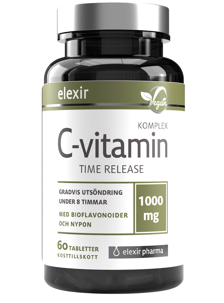Vårt nya C-vitamin 1000 mg Time Release utsöndras långsamt i upp till 8 timmar. Du kan alltså ta tabletten på morgonen och ha ett kontinuerligt upptag under hela arbetsdagen! C-vitaminet i tabletten är i form av granuler som löser sig sakta i tarmen vilket ger kroppen många små doser över tid istället för en enda stor dos. Den är dessutom kompletterad med bioflavonoider från bovete och acerola samt nyponpulver.