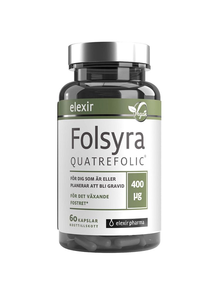 Som du läste inledningsvis så kommer ofta vitamin B9 i s.k. ”icke-aktiv” form i kosttillskott vilket gör att kroppen själv måste konvertera den till en aktiv form som sedan kan användas till olika funktioner i kroppen. Denna process är olika effektiv hos varje individ, därför är en aktiv (metylerad) form att föredra om man är eller vill bli gravid, för att säkerställa att man tillgodogör sig vitaminet. Vår produkt innehåller Quatrefolic® som är en patenterad form av aktivt folat med mycket hög biotillgänglighet som tas upp tre gånger snabbare av kroppen än vanlig folsyra. En kapsel innehåller 400 µg folat vilket är den dagliga dos Livsmedelsverket rekommenderar till gravida.