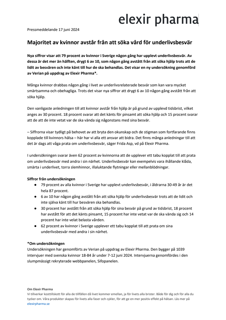 Undersökningen har genomförts av Verian på uppdrag av Elexir Pharma. Den bygger på 1039 intervjuer med svenska kvinnor 18-84 år under 7-12 juni 2024. Intervjuerna genomfördes i den slumpmässigt rekryterade webbpanelen, Sifopanelen.