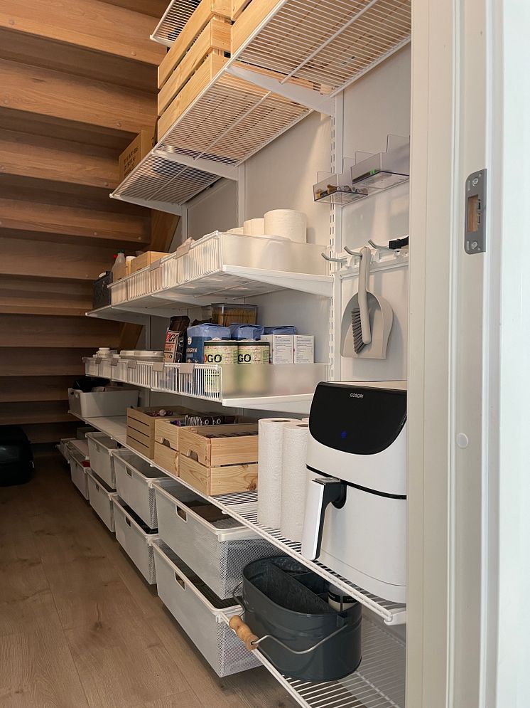 - Förvara bulkvaror som toa-/hushållspapper och städartiklar i trådhyllkorgar med avdelare. Det ger inte bara struktur utan även en tydlig överblick så att du alltid vet när något börjar ta slut.