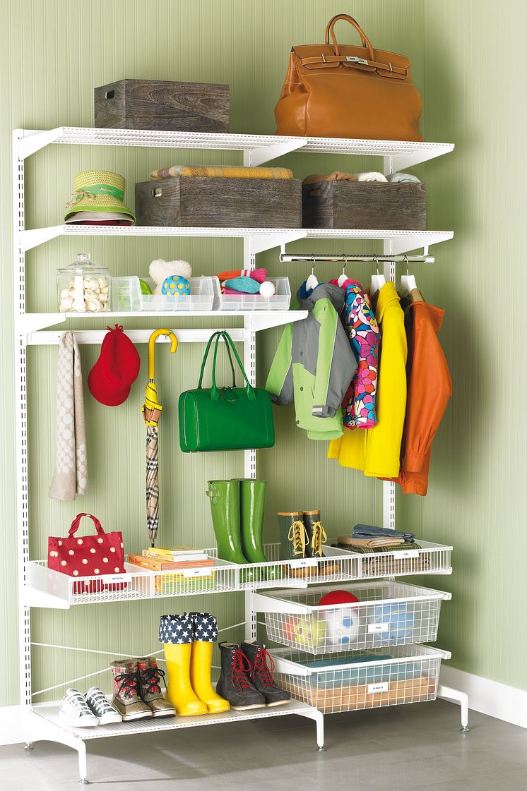 Smart och snygg hallförvaring med Elfa Freestanding, här med vita Classic-hyllor och Utility tillbehör. Vissa bilder kan innehålla produkter som inte längre säljs på vissa marknader, se elfa.com för aktuellt sortiment.