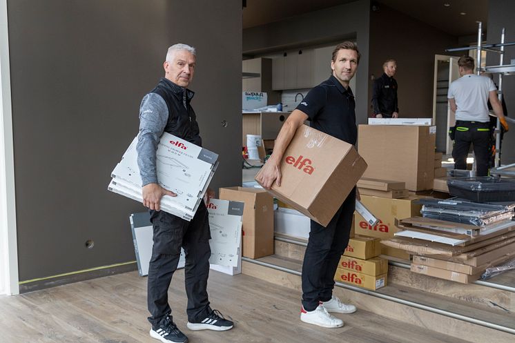Elfas förvaringsexpert Christine Dalman har, tillsammans med K-Bygg, planerat lösningarna. På plats i Stockholm har Elfas säljare Magnus Jonsson och Anders Gustafsson monterat och byggt upp fem fantastiska förvaringslösningar.