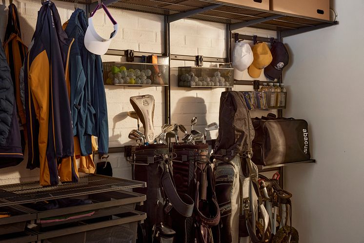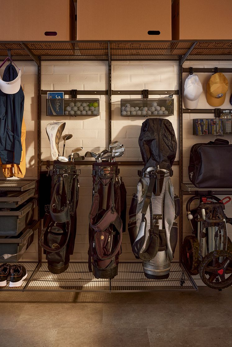 Med sin bakgrund i möbelbranschen, vet Sara hur viktigt det är att organisera sina saker ordentligt, så att hon enkelt kan hitta dem. Elfas hållare, som är särskilt avsedda för golfbagar, skapar både ordning och mer golvutrymme.