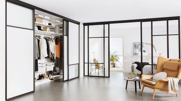 Gro och Anja valde den populära dörrmodellen Gallery, en modern ram med stilrena linjer. Ramfärgen Sanded Black har en matt, strukturerad yta. I deras förra bostad var färgerna mörka – svart, blått och grått. När de skulle börja på ny kula i ett hus nära havet ville de istället satsa på en ljus inredning, med tuffa kontraster. – Den svarta ramen på skjutdörrarna bryter av perfekt mot den romantiska rosa stilen, säger Gro.