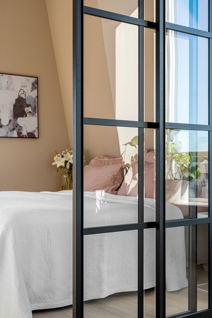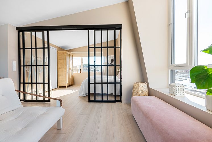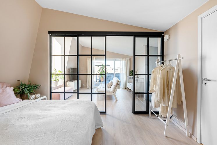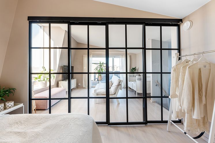 Övervåningen är ett härligt utrymme med jättestora fönster, ett badrum och en dörr som leder ut på terrassen. Många grannar har delat av det stora rummet till två mindre. – Utsikten är fantastisk och det kommer in mängder av ljus, så vi ville behålla den öppna känslan. Samtidigt ville vi ha någon form av avskärmning, eftersom vi sover här uppe. När vi såg att Elfas skjutdörrar kunde användas som avdelare kändes det som den självklara lösningen på alla våra önskemål. De delar av rummen, släpper igenom ljuset och blir ett läckert inslag i inredningen, säger Gro.