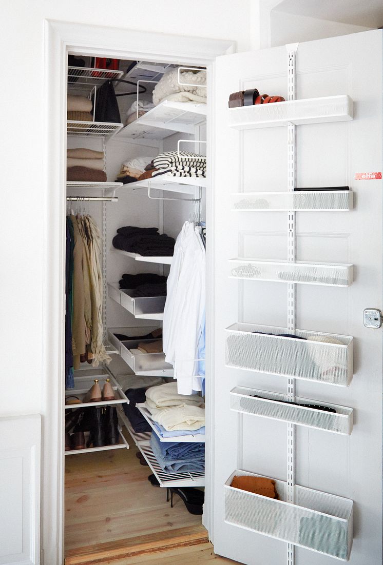 På garderobsdörren sitter en hängskena med meshkorgar fäst med ett speciellt topp- och bottenfäste som Elfa säljer. Bra och praktiskt att slippa borra i dörren.