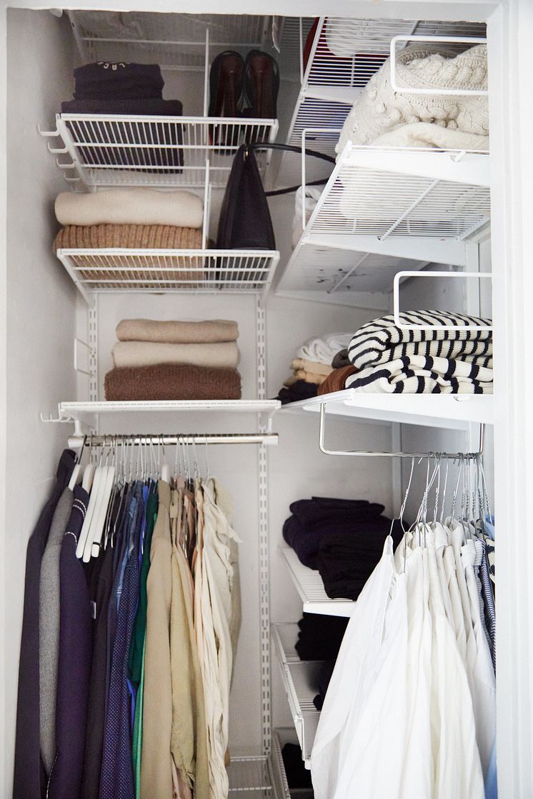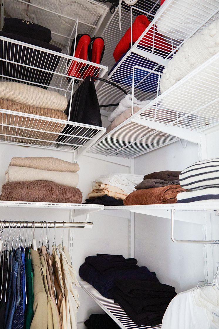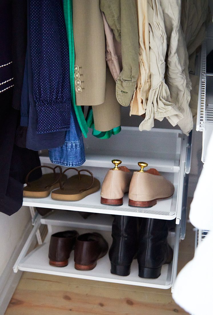 Mode- och hållbarhetsprofilen Emma Elwin fick begränsat utrymme för alla sina kläder i nya, mindre boendet. Elfas trådhyllor och smarta lösningar med att bygga på höjden maximerade möjligheterna för den minimalistiska garderoben.