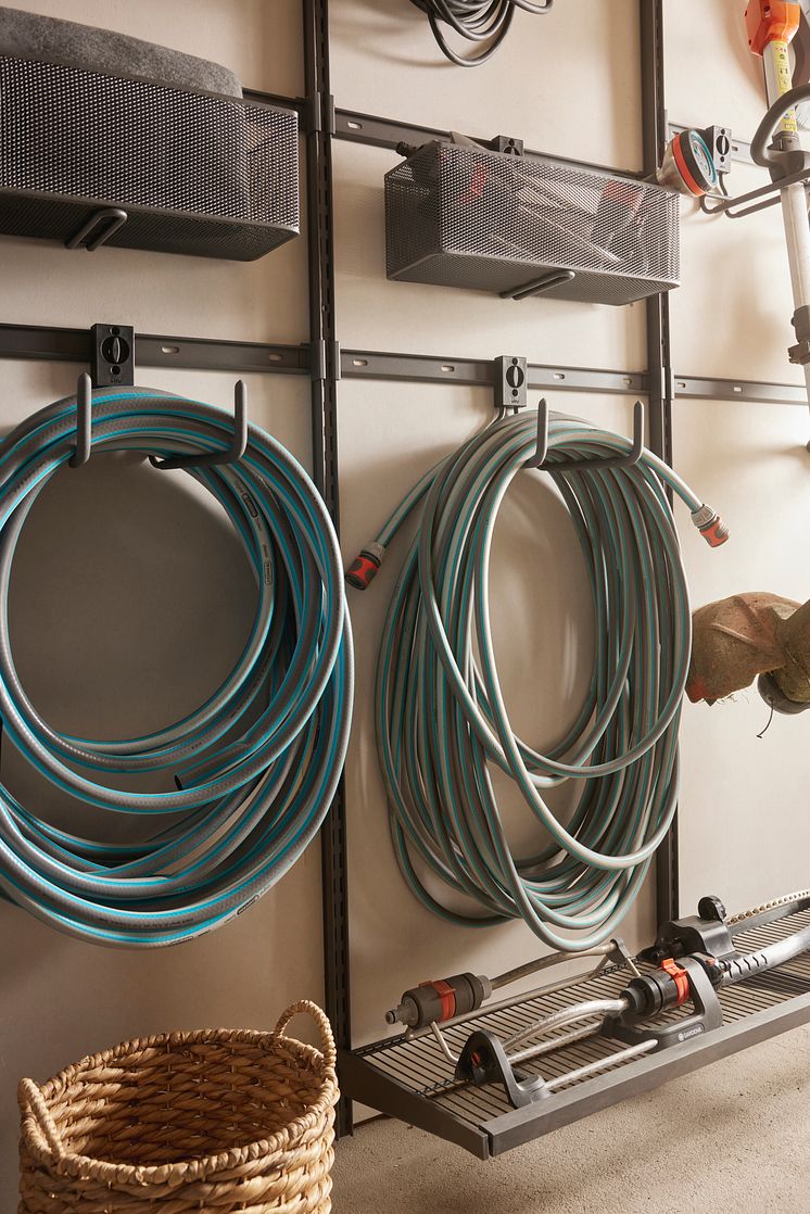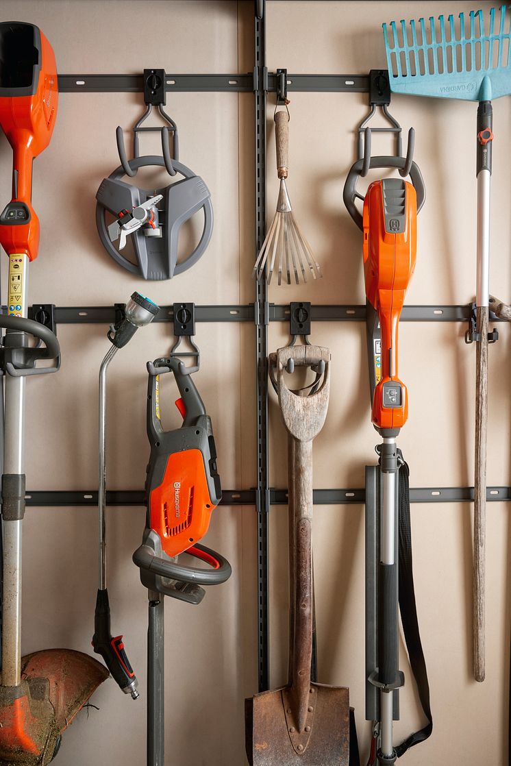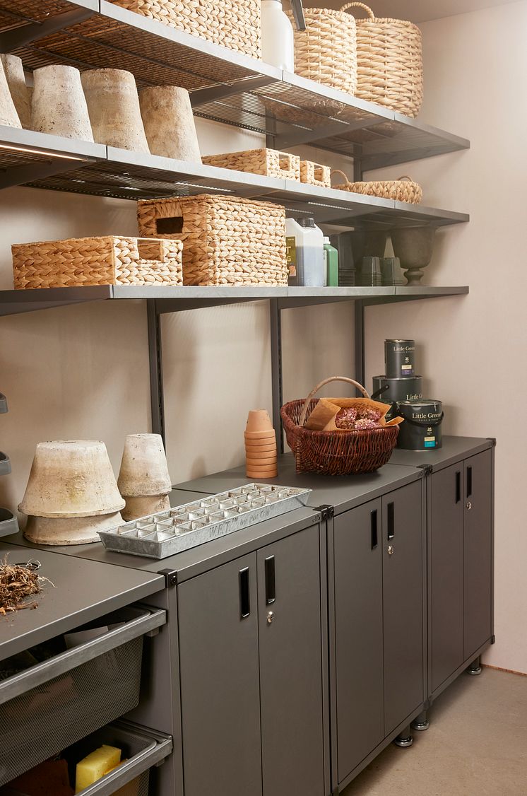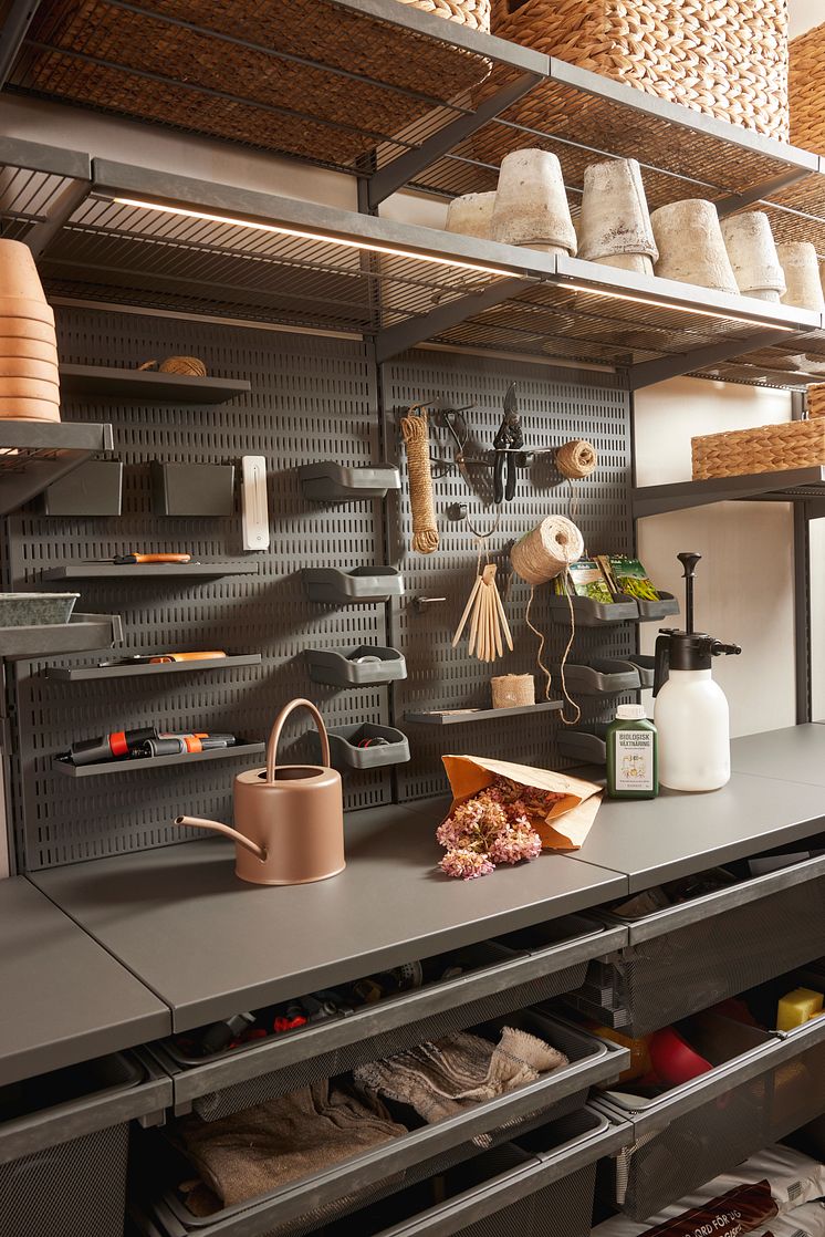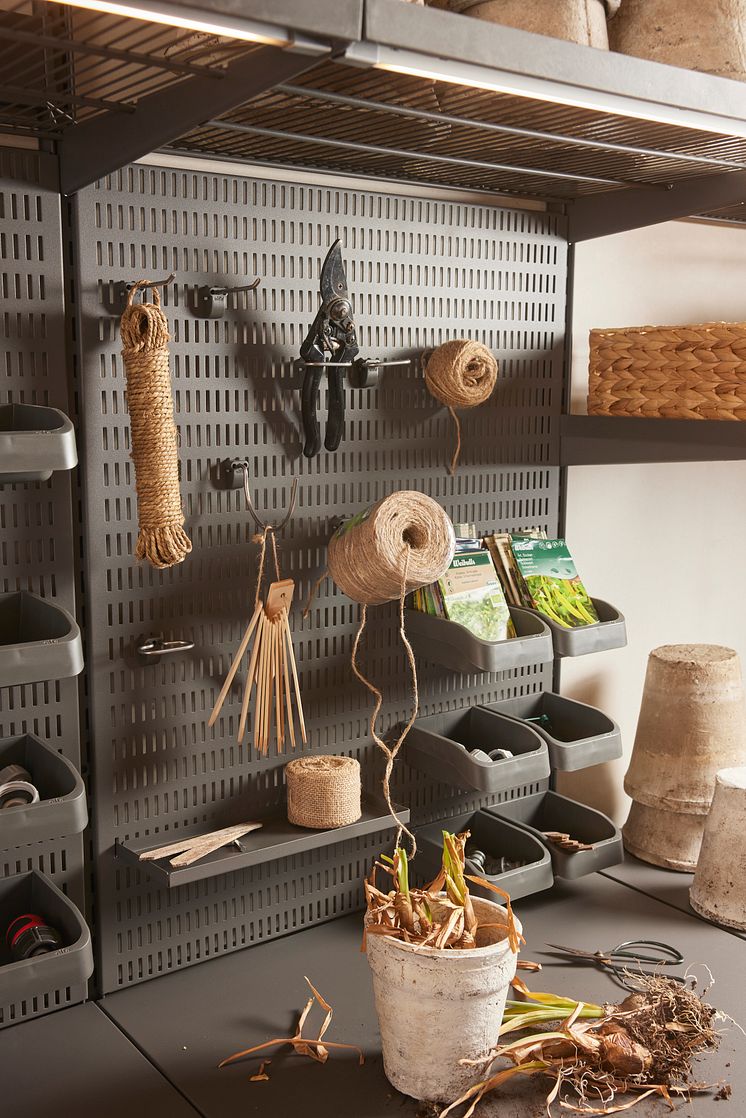 Tillsammans med förvaringsexperten ryckte Elfa-teamet ut och analyserade förvaringsbehoven för trädgårdsfantasten Carin. De ritade upp hur förrådet kunde se ut, med tydliga lister, krokar, meshbackar, hyllor, förvaringstavlor, lådor och skåp i en enhetlig, snygg mörkgrå nyans.