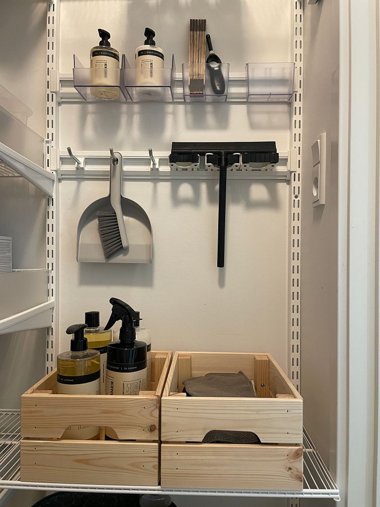 – Med Elfas dörrförvaring kan du enkelt placera ut meshkorgar i olika storlekar för flaskor, burkar och städmaterial. Jag gillar även deras hållare för presentpapper som är väldigt praktisk att placera på dörren.