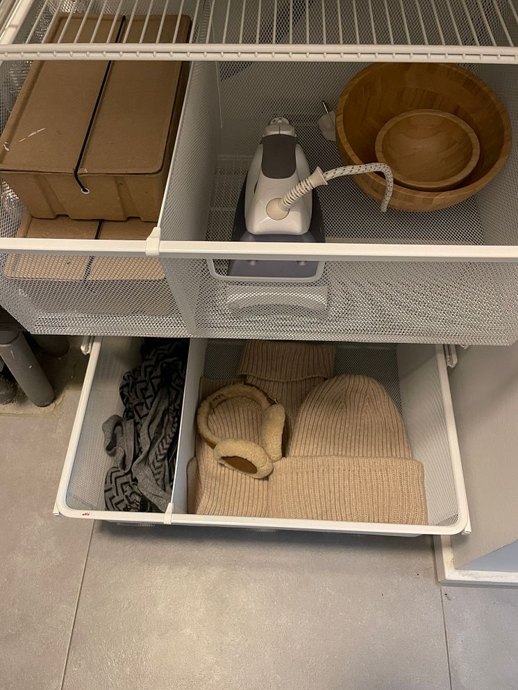 Större väskor som används sällan, har placerats på de övre hyllplanen och i några av de transparenta, utdragbara meshbackarna förvaras strykjärn och vinteraccessoarer.