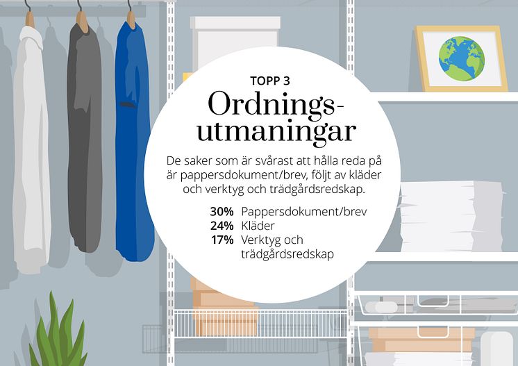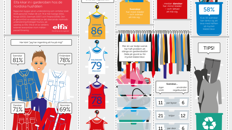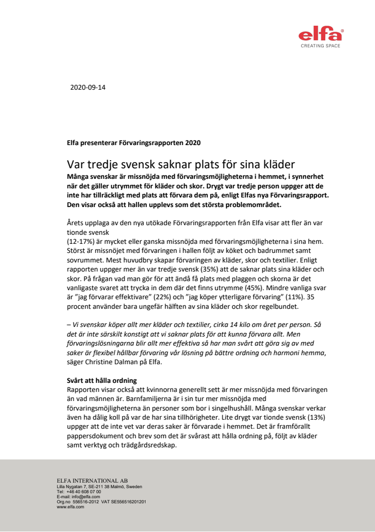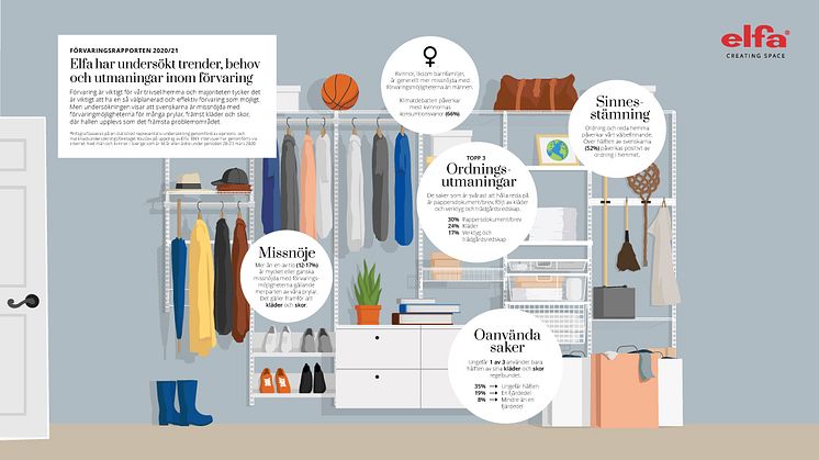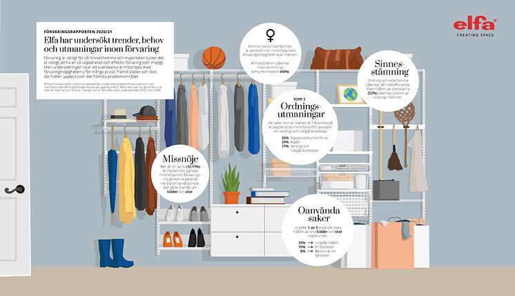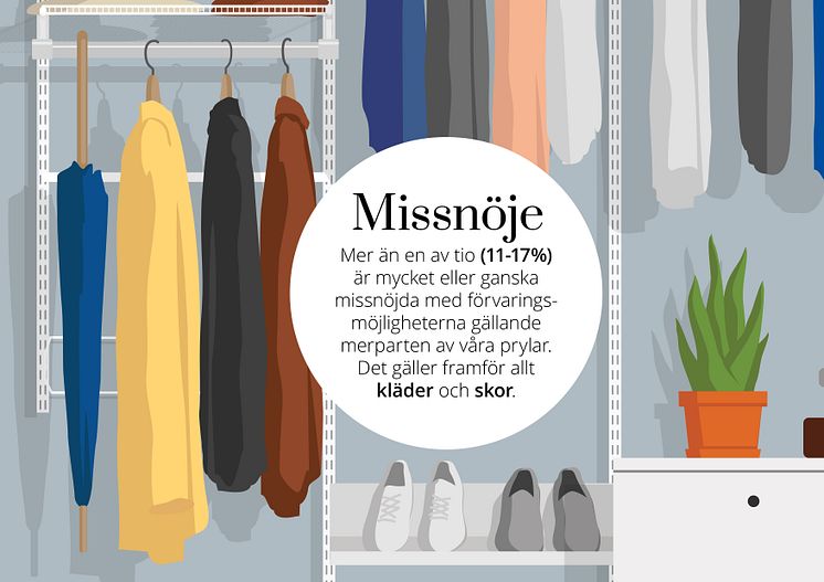 Årets upplaga av den nya utökade Förvaringsrapporten från Elfa visar att fler än var tionde svensk (11-17%) är mycket eller ganska missnöjda med förvaringsmöjligheterna i sina hem. Störst är missnöjet med förvaringen i hallen följt av köket och badrummet samt sovrummet. Mest huvudbry skapar förvaringen av kläder, skor och textilier. Enligt rapporten uppger mer än var tredje svensk (35%) att de saknar plats sina kläder och skor. På frågan vad man gör för att ändå få plats med plaggen och skorna är det vanligaste svaret att trycka in dem där det finns utrymme (45%). Mindre vanliga svar är ”jag förvarar effektivare” (22%) och ”jag köper ytterligare förvaring” (11%). 35 procent använder bara ungefär hälften av sina kläder och skor regelbundet.
