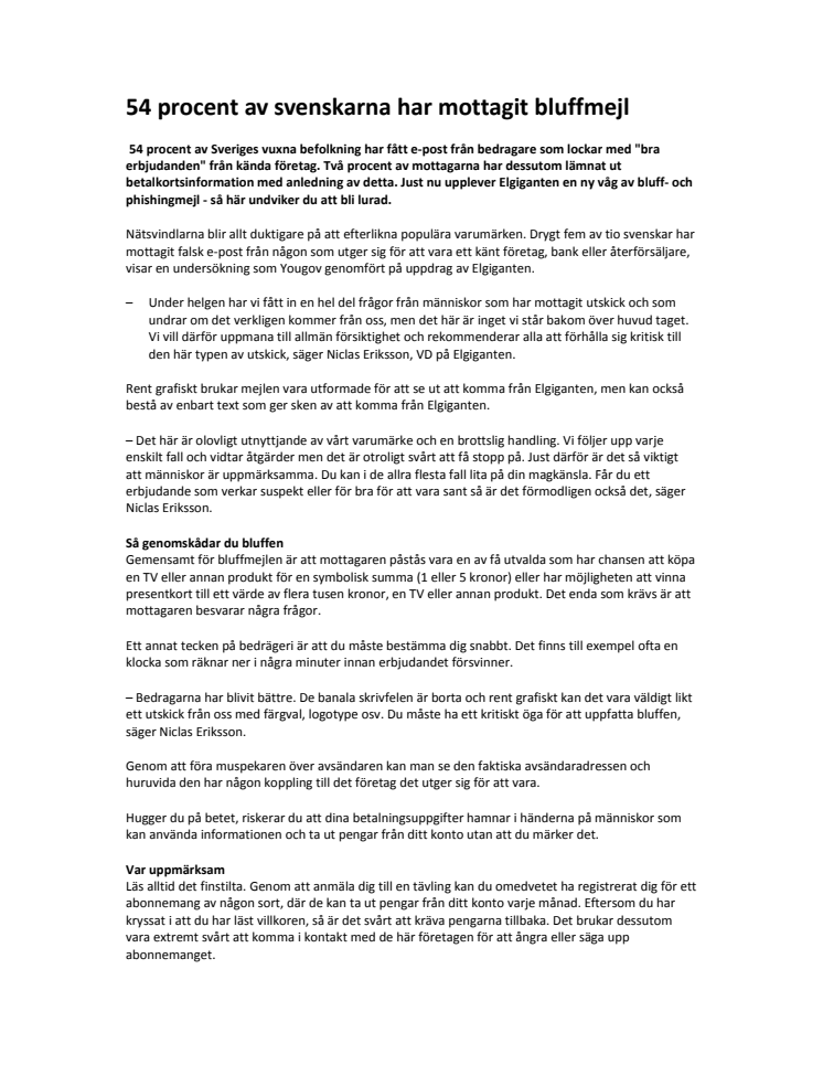 54 procent av Sveriges vuxna befolkning har fått e-post från bedragare som lockar med "bra erbjudanden" från kända företag. Två procent av mottagarna har dessutom lämnat ut betalkortsinformation med anledning av detta. Just nu upplever Elgiganten en ny våg av bluff- och phishingmejl - så här undviker du att bli lurad.