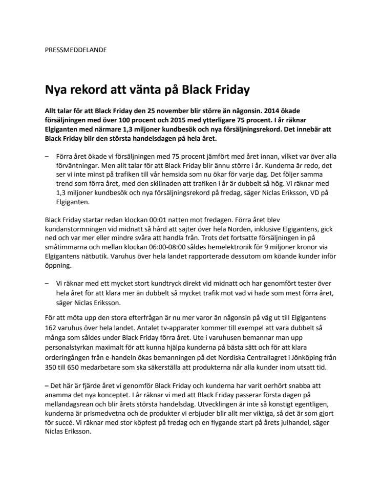 Allt talar för att Black Friday den 25 november blir större än någonsin. 2014 ökade försäljningen med över 100 procent och 2015 med ytterligare 75 procent. I år räknar Elgiganten med närmare 1,3 miljoner kundbesök och nya försäljningsrekord. Det innebär att Black Friday blir den största handelsdagen på hela året.
