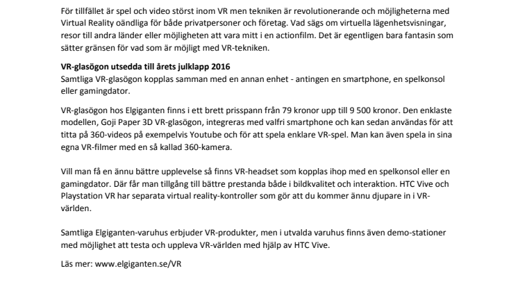 VR‐glasögon hos Elgiganten finns i ett brett prisspann från 79 kronor upp till 9 500 kronor. Den enklaste modellen, Goji Paper 3D VR‐glasögon, integreras med valfri smartphone och kan sedan användas för att titta på 360‐videos på exempelvis Youtube och för att spela enklare VR‐spel. Man kan även spela in sina egna VR‐filmer med en så kallad 360‐kamera.