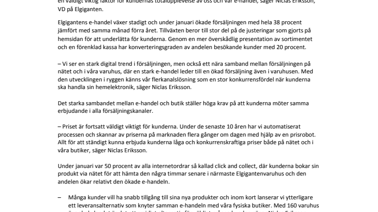Elgigantens e-handel växer stadigt och under januari ökade försäljningen med hela 38 procent jämfört med samma månad förra året. Tillväxten beror till stor del på de justeringar som gjorts på hemsidan för att underlätta för kunderna. Genom en mer överskådlig presentation av sortimentet och en förenklad kassa har konverteringsgraden av andelen besökande kunder ökat med 20 procent.