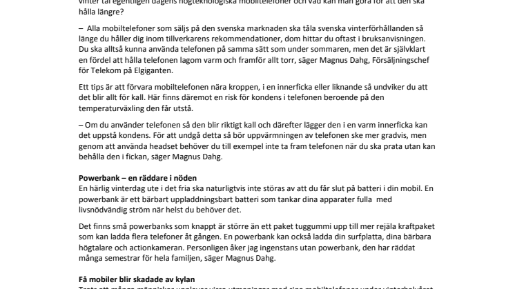 – Alla mobiltelefoner som säljs på den svenska marknaden ska tåla svenska vinterförhållanden så länge du håller dig inom tillverkarens rekommendationer, dom hittar du oftast i bruksanvisningen. Du ska alltså kunna använda telefonen på samma sätt som under sommaren, men det är självklart en fördel att hålla telefonen lagom varm och framför allt torr, säger Magnus Dahg, Försäljningschef för Telekom på Elgiganten.