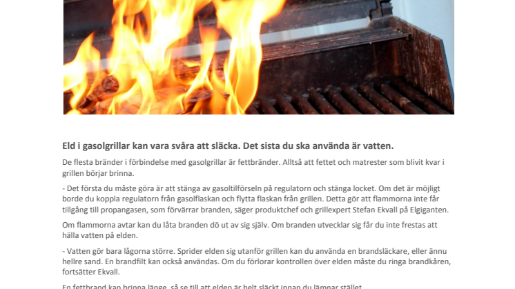 Eld i gasolgrillar kan vara svåra att släcka. Det sista du ska använda är vatten.