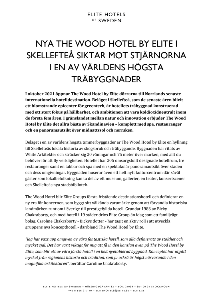 Elite Hotels grundades 1991 av Bicky Chakraborty, vars vision om att återställa vackra hotell till sin forna glans lever idag vidare genom hans dotter och Elite Hotels ägare Caroline Chakraborty. Vi fortsätter dessutom att skapa helt nya hotellupplevelser med mål om att göra dem till ortens stolthet och självklara medelpunkt. Idag erbjuder vi ett fyrtiotal centrala hotell över hela Sverige, gastropubkedjan The Bishops Arms, Vana Spa och många unika restaurangkoncept.