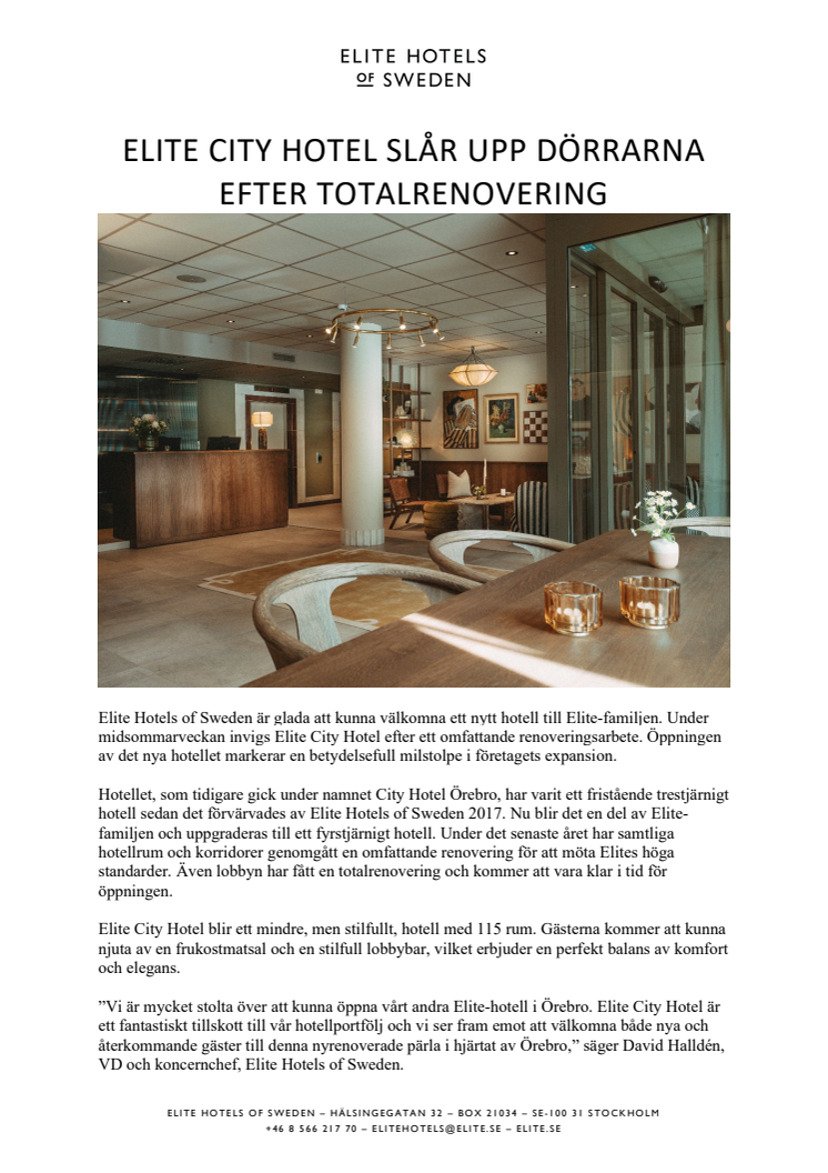 ”Vi är mycket stolta över att kunna öppna vårt andra Elite-hotell i Örebro. Elite City Hotel är ett fantastiskt tillskott till vår hotellportfölj och vi ser fram emot att välkomna både nya och återkommande gäster till denna nyrenoverade pärla i hjärtat av Örebro,” säger David Halldén, VD och koncernchef, Elite Hotels of Sweden.