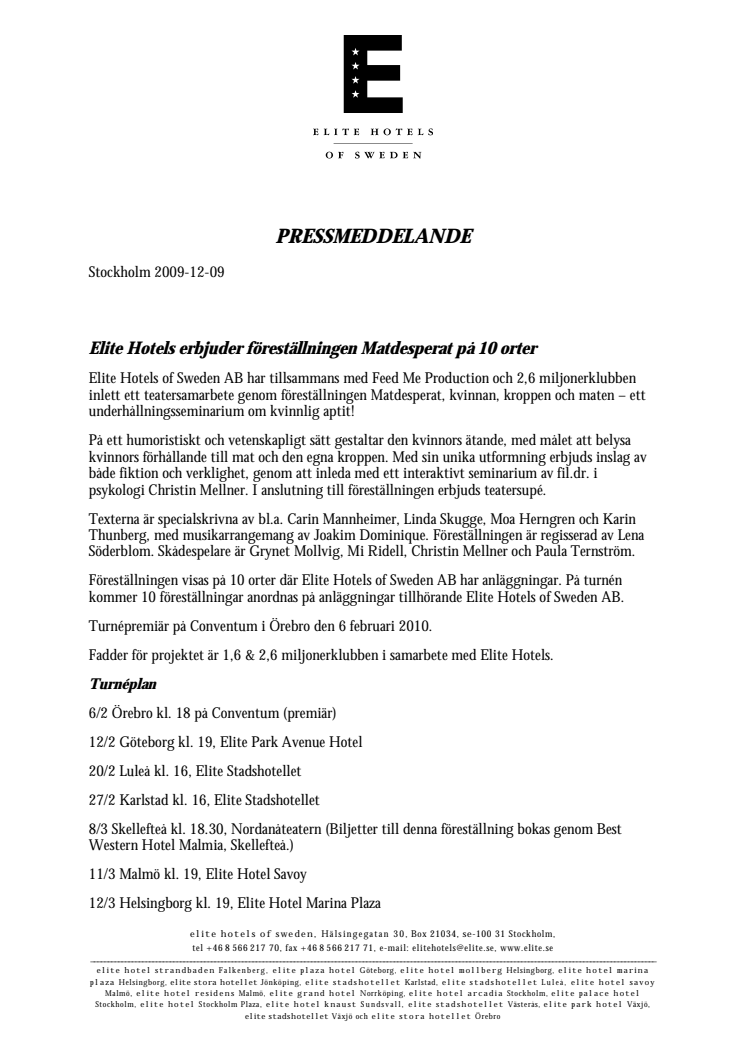 Elite Hotels of Sweden AB har tillsammans med Feed Me Production och 2,6 miljonerklubben inlett ett teatersamarbete genom föreställningen Matdesperat, kvinnan, kroppen och maten – ett underhållningsseminarium om kvinnlig aptit!