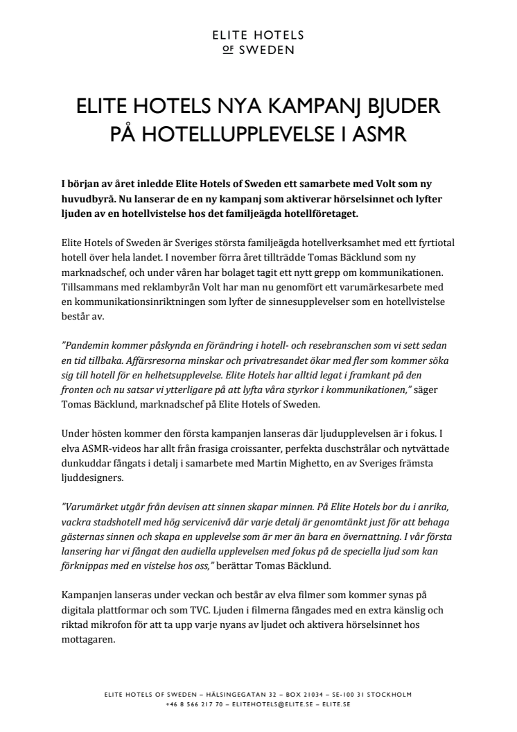 Elite Hotels of Sweden är Sveriges största familjeägda hotellverksamhet med ett fyrtiotal hotell över hela landet. I november förra året tillträdde Tomas Bäcklund som ny marknadschef, och under våren har bolaget tagit ett nytt grepp om kommunikationen. Tillsammans med reklambyrån Volt har man nu genomfört ett varumärkesarbete med en kommunikationsinriktningen som lyfter de sinnesupplevelser som en hotellvistelse består av.