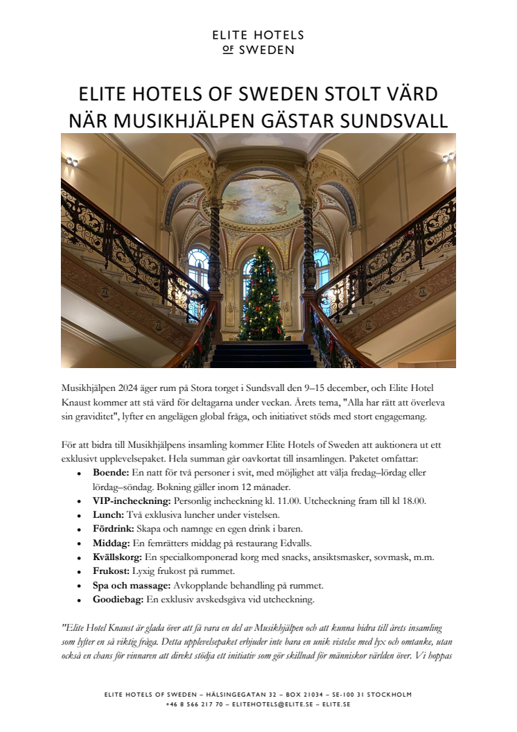 "Elite Hotel Knaust är glada över att få vara en del av Musikhjälpen och att kunna bidra till årets insamling som lyfter en så viktig fråga. Detta upplevelsepaket erbjuder inte bara en unik vistelse med lyx och omtanke, utan också en chans för vinnaren att direkt stödja ett initiativ som gör skillnad för människor världen över. Vi hoppas att vårt bidrag inte bara inspirerar våra gäster, utan också uppmuntrar fler att delta i insamlingen och stödja det fantastiska arbete som Musikhjälpen gör.", Anna Söderström, Hotelldirektör, Elite Hotel Knaust.