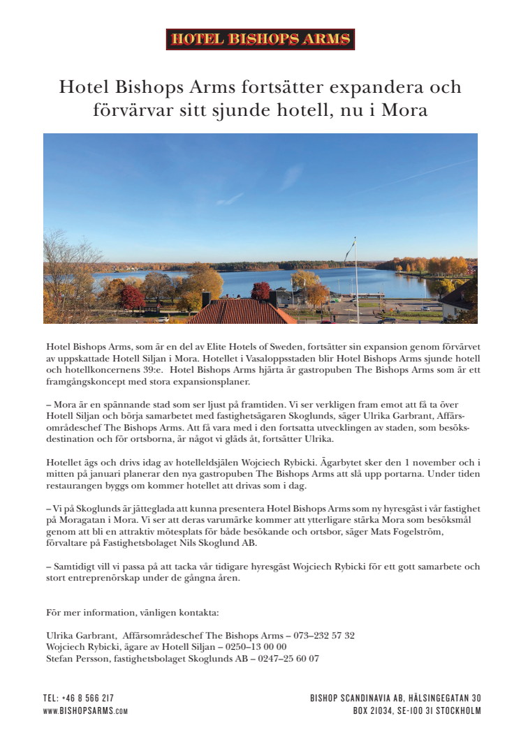 Hotel Bishops Arms, som är en del av Elite Hotels of Sweden, fortsätter sin expansion genom förvärvet av uppskattade Hotell Siljan i Mora. Hotellet i Vasaloppsstaden blir Hotel Bishops Arms sjunde hotell och hotellkoncernens 39:e.Hotel Bishops Arms hjärta är gastropuben The Bishops Arms som är ett framgångskoncept med stora expansionsplaner.