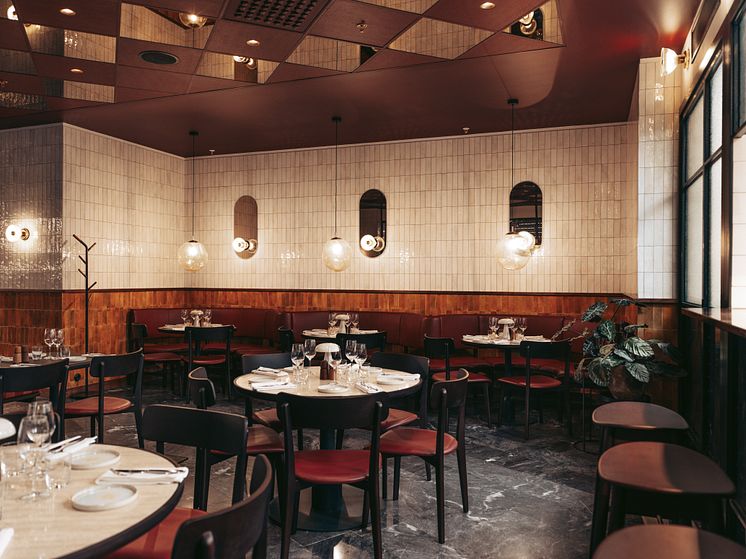 ”Panza är en modern trattoria som med lekfulla inslag i färg och detaljer, flörtar med italiensk postmodernism. Gästen rör sig mellan en öppen del med kontakt till gatan, passerar en informell bar till ett intimt vinrum och vidare till en inre matsal med båssittning och kontakt med det öppna köket.”, säger Filip Svensson, arkitekt, Skuggan.