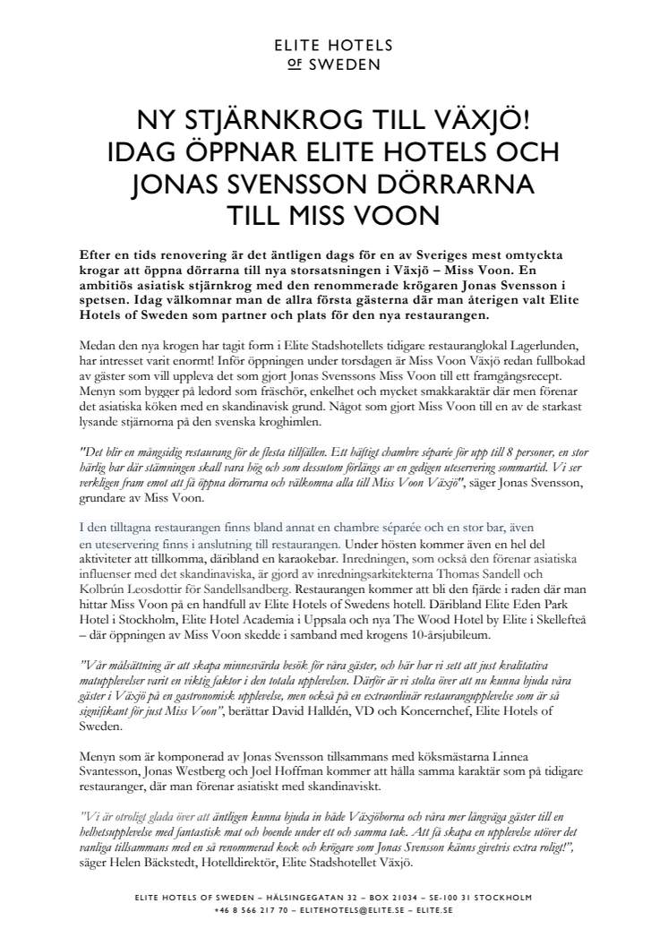 ”Vår målsättning är att skapa minnesvärda besök för våra gäster, och här har vi sett att just kvalitativa matupplevelser varit en viktig faktor i den totala upplevelsen. Därför är vi stolta över att nu kunna bjuda våra gäster i Växjö på en gastronomisk upplevelse, men också på en extraordinär restaurangupplevelse som är så signifikant för just Miss Voon”, berättar David Halldén, VD och Koncernchef, Elite Hotels of Sweden.