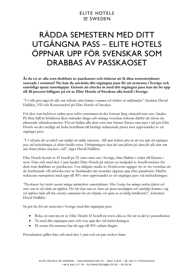 Elite Hotels består av 41 hotell på 25 orter runt om i Sverige, från Malmö i söder till Kiruna i norr. Från och med den 1 juni bjuder Elite Hotels på nästan en tredjedel av hotellvistelsen för dem som drabbats av passkaoset. I en tidigare studie av Hotels.com uppgav tre av tio svenskar att de fortfarande vill utforska mer av hemlandet när resandet öppnat upp efter pandemin. Därför reduceras rumspriset med upp till 30% mot uppvisandet av ett utgånget pass vid incheckningen.