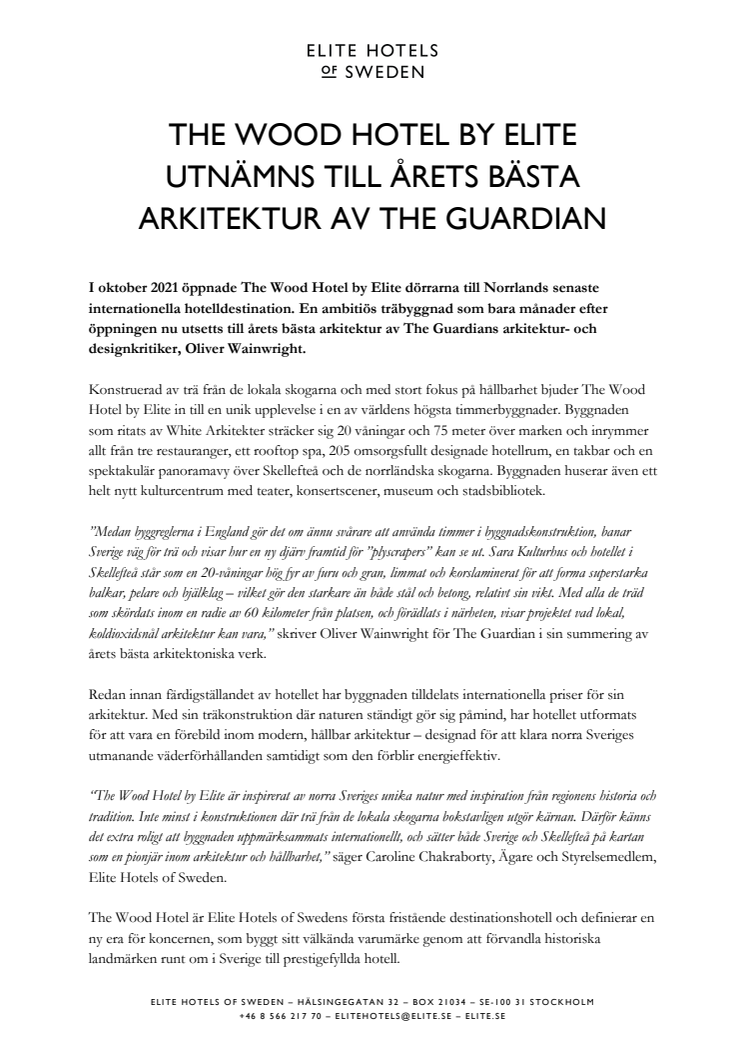 “The Wood Hotel by Elite är inspirerat av norra Sveriges unika natur med inspiration från regionens historia och tradition. Inte minst i konstruktionen där trä från de lokala skogarna bokstavligen utgör kärnan. Därför känns det extra roligt att byggnaden uppmärksammats internationellt, och sätter både Sverige och Skellefteå på kartan som en pionjär inom arkitektur och hållbarhet,” säger Caroline Chakraborty, Ägare och Styrelsemedlem, Elite Hotels of Sweden.