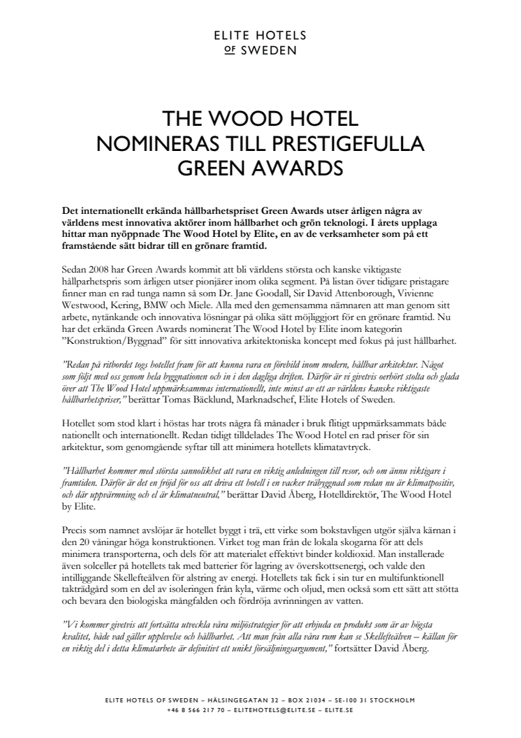 Sedan 2008 har Green Awards kommit att bli världens största och kanske viktigaste hållparhetspris som årligen utser pionjärer inom olika segment. På listan över tidigare pristagare finner man en rad tunga namn så som Dr. Jane Goodall, Sir David Attenborough, Vivienne Westwood, Kering, BMW och Miele. Alla med den gemensamma nämnaren att man genom sitt arbete, nytänkande och innovativa lösningar på olika sätt möjliggjort för en grönare framtid. Nu har det erkända Green Awards nominerat The Wood Hotel by Elite inom kategorin ”Konstruktion/Byggnad” för sitt innovativa arkitektoniska koncept med fokus på just hållbarhet.