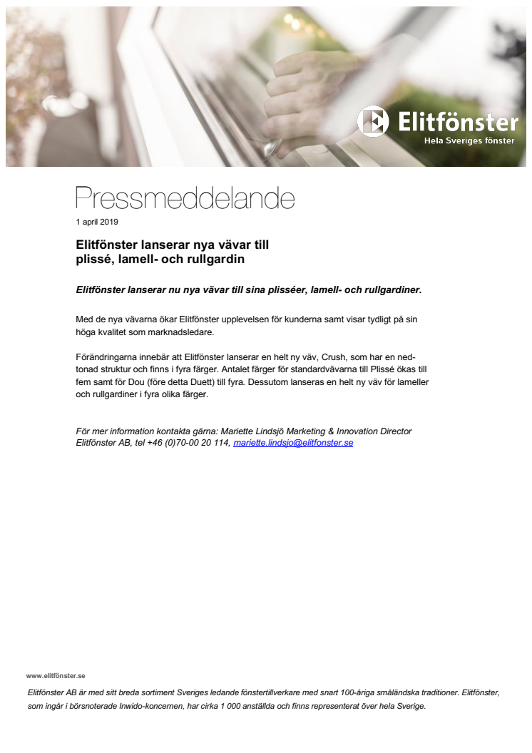 Elitfönster lanserar nya vävar till plisséer, lamell- och rullgardiner.