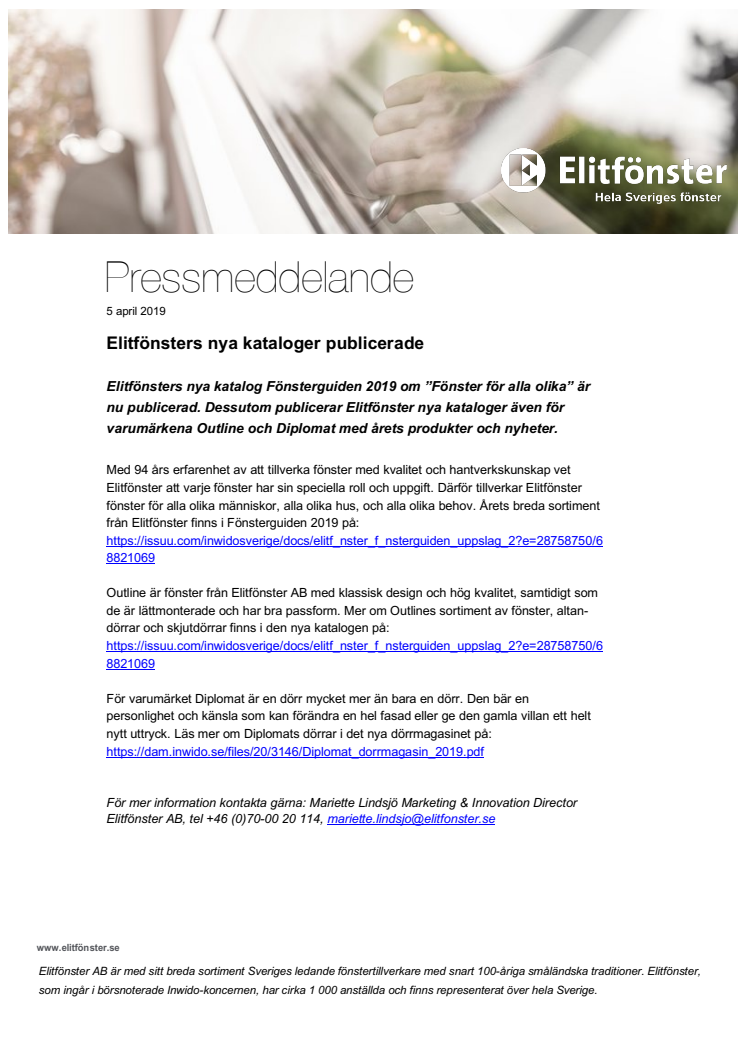 Elitfönsters nya katalog Fönsterguiden 2019 om ”Fönster för alla olika” är nu publicerad. Dessutom publicerar Elitfönster nya kataloger för varumärkena Outline och Diplomat.