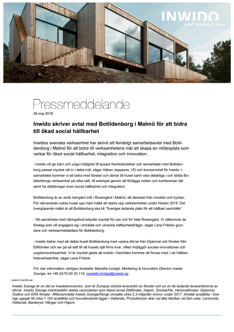 Inwidos svenska verksamhet har skrivit ett femårigt samarbetsavtal med Botildenborg i Malmö för att bidra till verksamhetens mål att skapa en mötesplats som verkar för ökad social hållbarhet, integration och innovation.