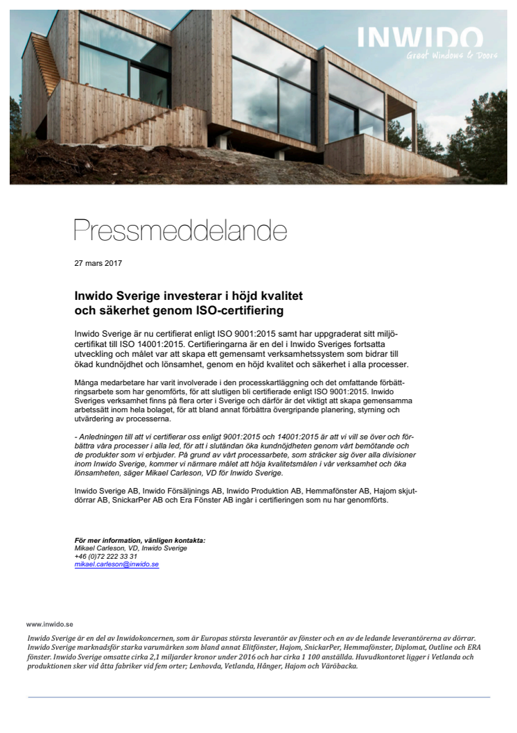 Inwido Sverige är nu certifierat enligt ISO 9001:2015 samt har uppgraderat sitt miljöcertifikat till ISO 14001:2015. Målet var att skapa ett gemensamt verksamhetssystem som bidrar till ökad kundnöjdhet och lönsamhet, genom en höjd kvalitet och säkerhet i alla processer.